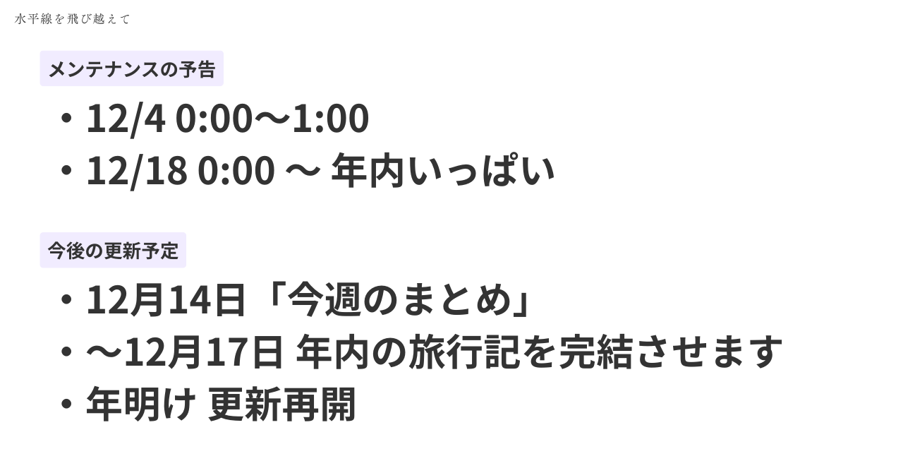 ブログ「水平線を飛び越えて」のメンテナンスと、今後の更新予定についてお知らせいたします。