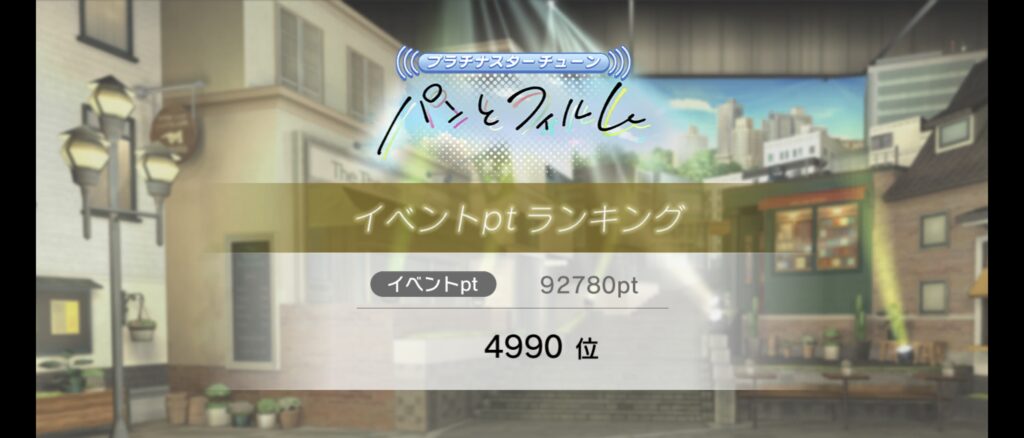 ギブミーメタファーはだいたい同じくらいのイベントptでゴールしてブロンズだったので、1位の数値が過去最高を記録したのはすげーと思いつつも、個人的にはボーダー的な意味で「田中琴葉がいないイベントだなー」とか思ったり。